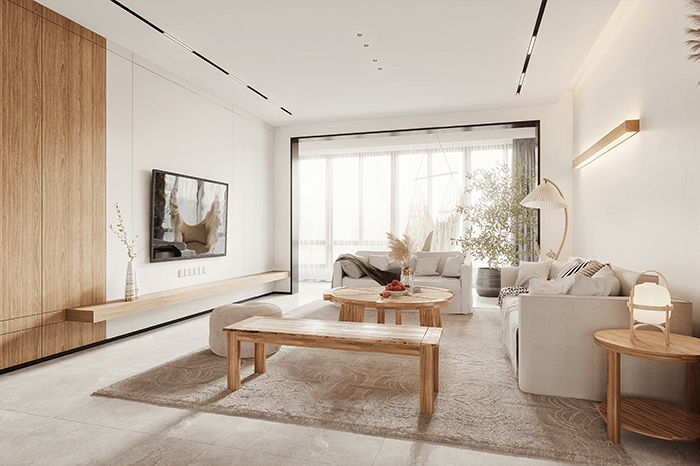 裝修特點(diǎn):進(jìn)入了戶門就可以欣賞到家居空間中對(duì)外的公共部分,客廳、餐廳都是為了招待來賓和宴請(qǐng)朋友用的,起居室一般較客廳空間低矮平和,選材上也多取舒適、柔性、溫馨的材質(zhì)組合,可以有效地建立起一種溫情暖意的家庭氛圍,電視等娛樂用品也放在這一空間中,可以想象在電視廣告的聲色、鍋碗瓢盆的和樂、孩子嬉戲的雜音下,這“三區(qū)一體”的其樂融融。